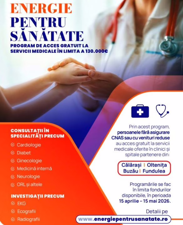 În perioada 15 aprilie- 15 mai 2026, persoane fără asigurare medicală sau cu venituri reduse vor putea beneficia de consultații și investigații medicale gratuite în Călărași, Oltenița, Fundulea și Buzău, prin intermediul unor unități medicale partenere.