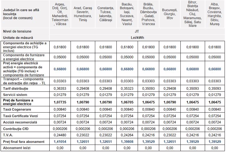 Prețul din această ofertă este unul competitiv în condițiile actuale, de 0,668 lei/kWh, la nivel de energie activă, ceea ce face ca prețul final facturat, cu tot cu tarife de rețea și taxe, să fie cuprins între 1,32 și 1,41 lei/kWh, în funcție de zona de rețea.